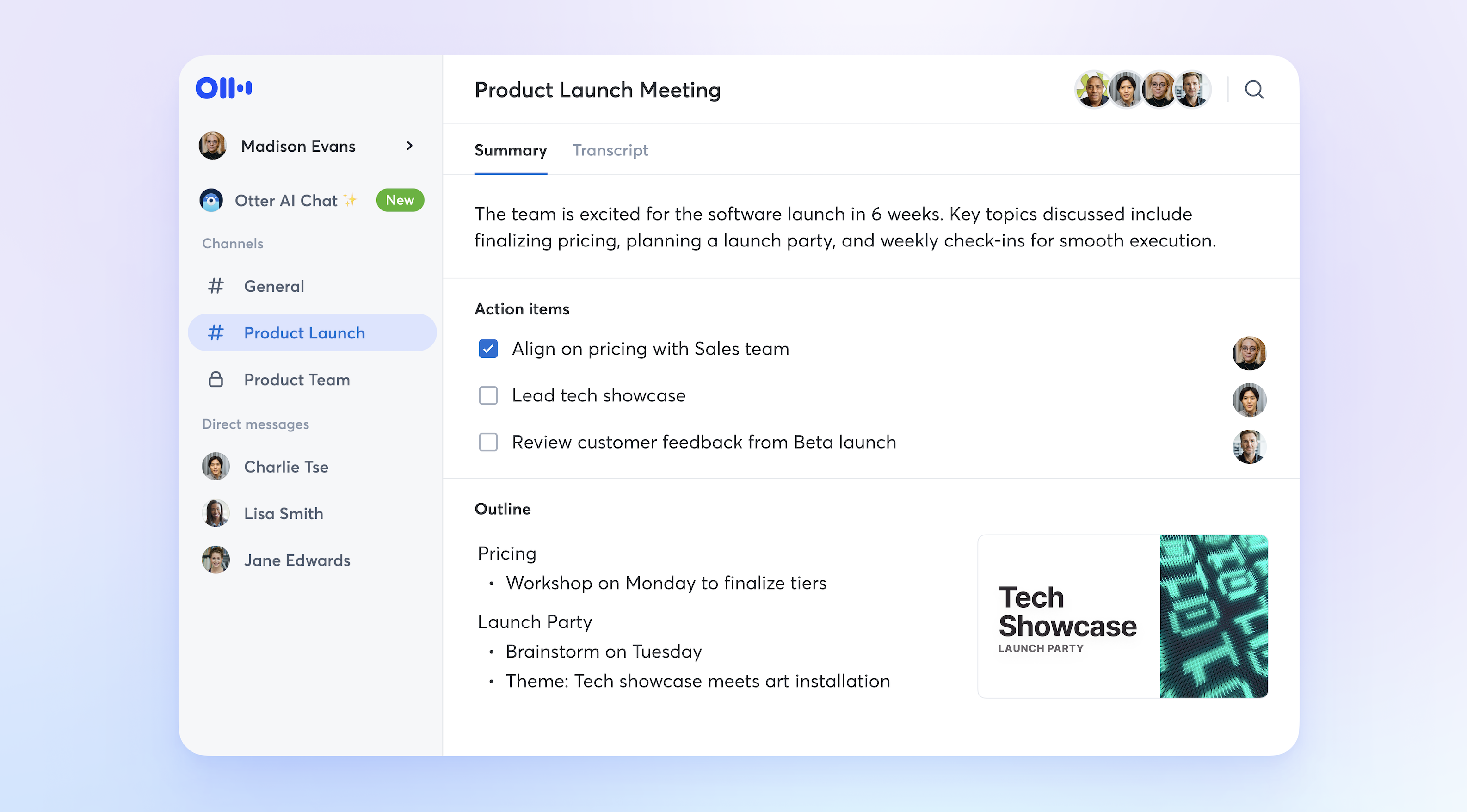 - Otter AI Chat: You can ask Otter questions about the meeting during or after and even chat with team members without interrupting the meeting discussion. In addition you can use Otter AI Chat across all your meetings or for specific meeting or group of meeting using Otter AI Chat in channels.