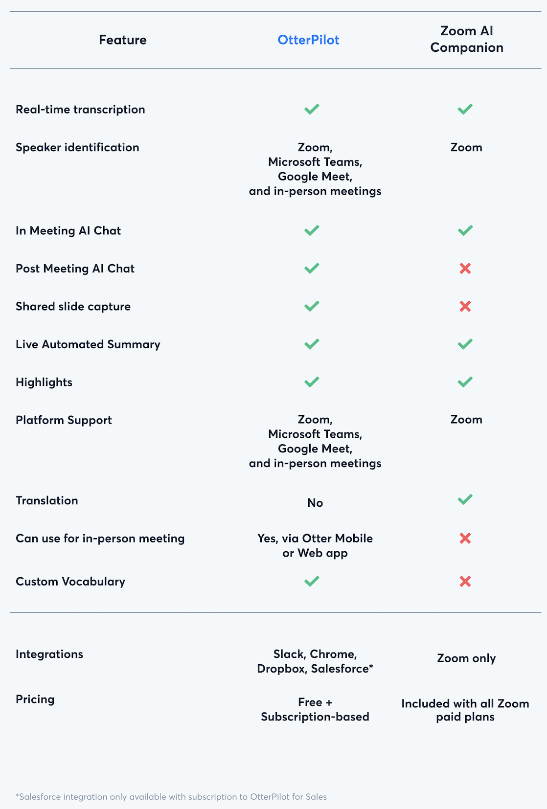 Another key difference between the two AI assistants is their pricing. Otter is available in all Otter plans including Otter Basic which is free, while Zoom AI Companion is only included with certain Zoom paid plans. Please consult each company's pricing page for most up to date pricing information: