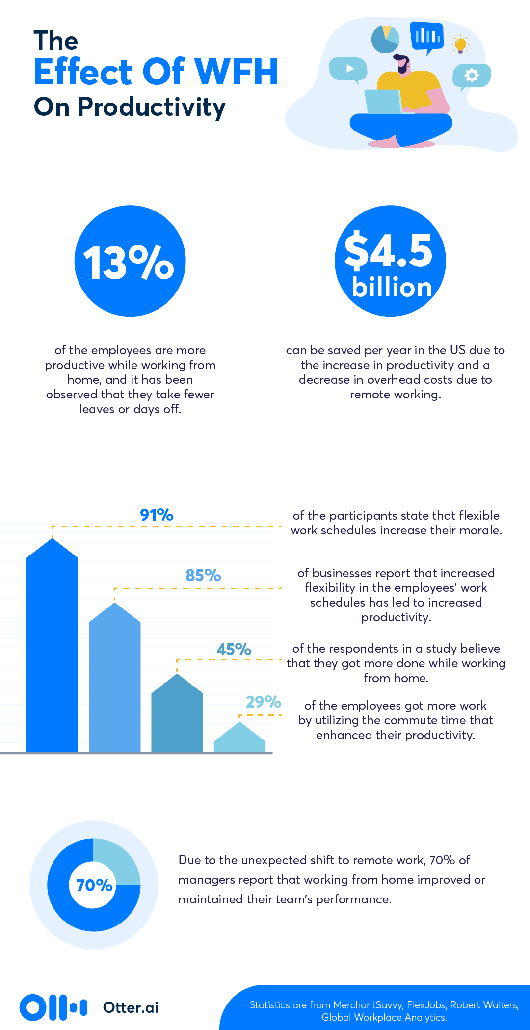 - It has been estimated that the U.S. alone can save $4.5 billion in savings per year due to the increase in productivity and a decrease in overhead costs due to remote working. (MerchantSavvy)